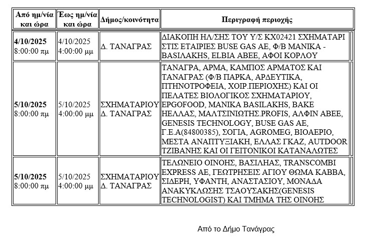 Ο Δήμος Τανάγρας ενημερώνει για προγραμματισμένες διακοπές ρεύματος που ανακοίνωσε η ΔΕΔΔΗΕ.