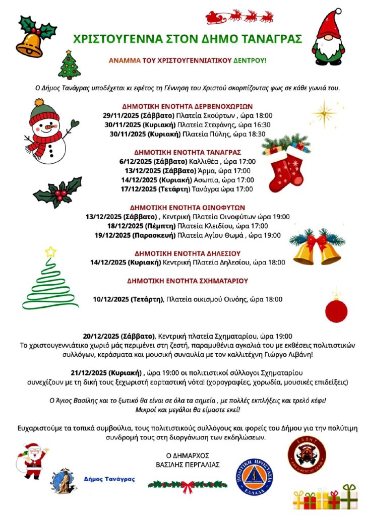 Πρόγραμμα Χριστουγεννιάτικων εκδηλώσεων 2025 Δήμου Τανάγρας